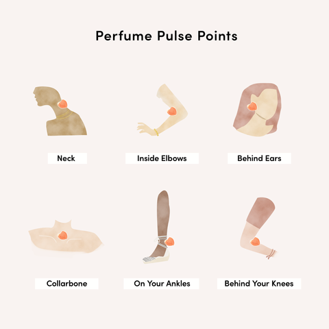 Parfum bereaksi terhadap panas, dan mengaplikasikannya pada titik-titik nadi Anda dapat membantu melepaskan aroma sepanjang hari. Semprotkan parfum Anda ke pergelangan tangan, tengkuk, bagian dalam siku, dan bagian belakang lutut.